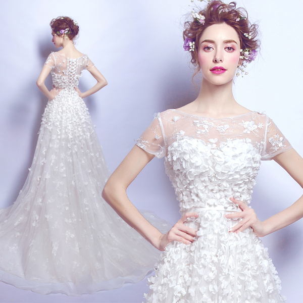 > Wedding & Events > Wedding Dresses > Elegant romantic flower fairy princess bride lace tailed wedding dressStyle&Regions:European